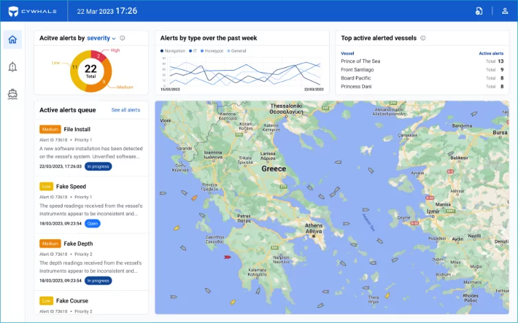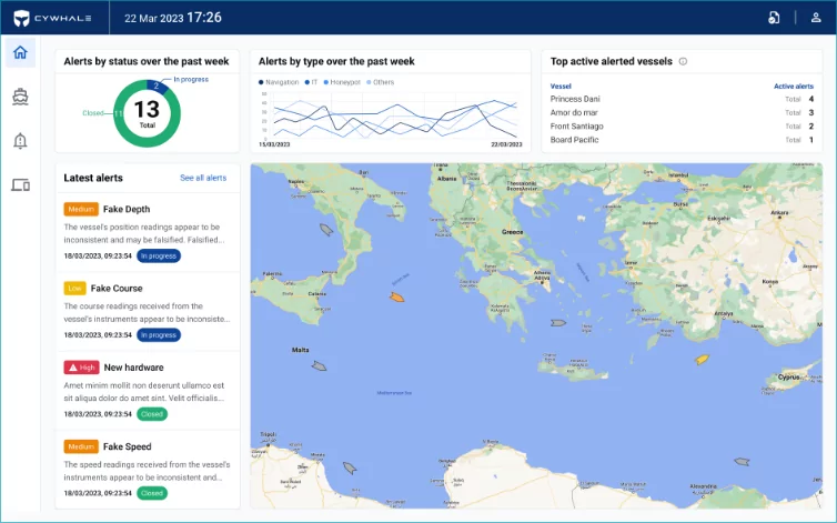 The system monitors critical systems, detects cyber anomalies on both IT and OT networks, and delivers real-time alerts via satellite. It includes asset management tools, ensuring shipping companies maintain full control over their fleet and its onboard digital assets.